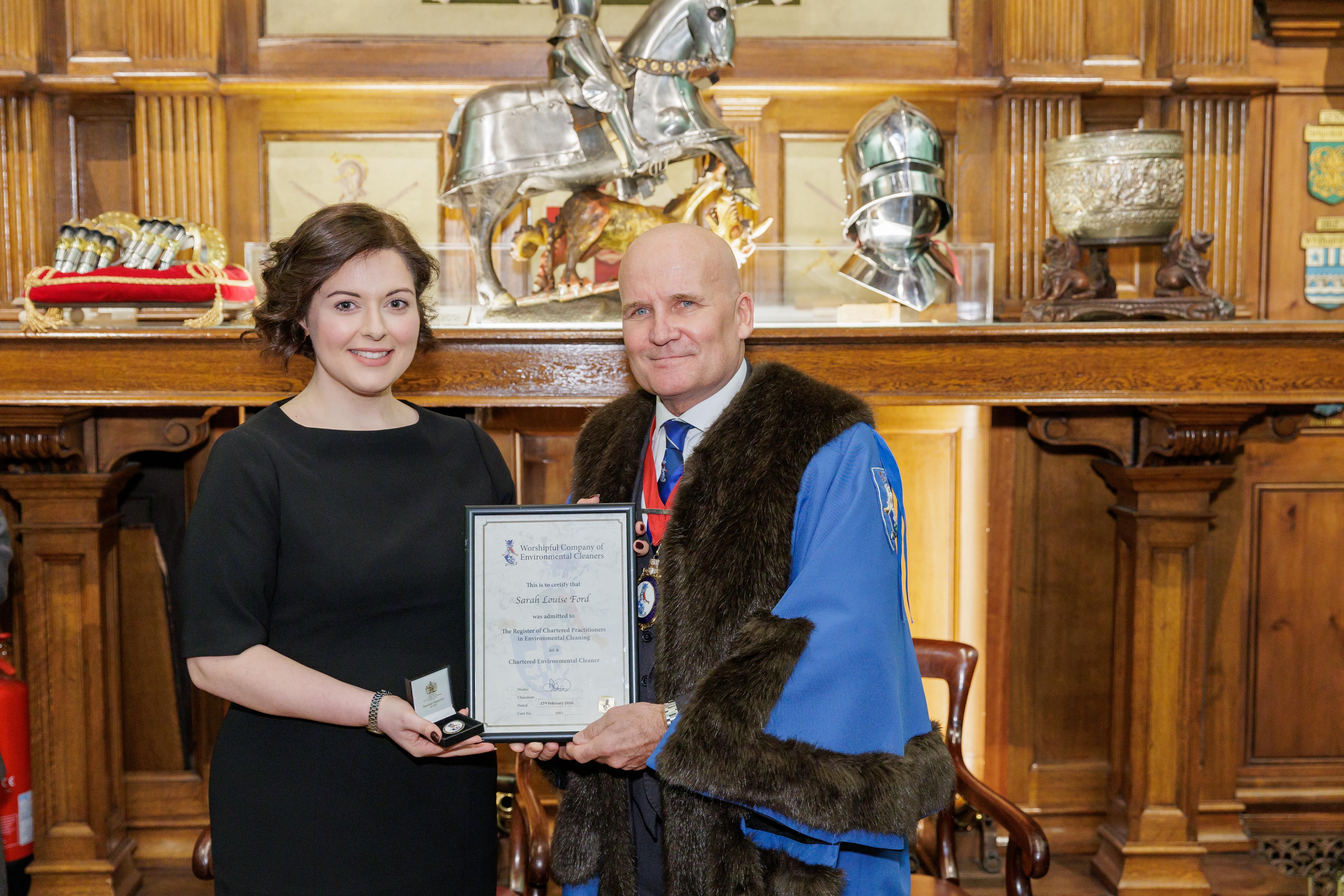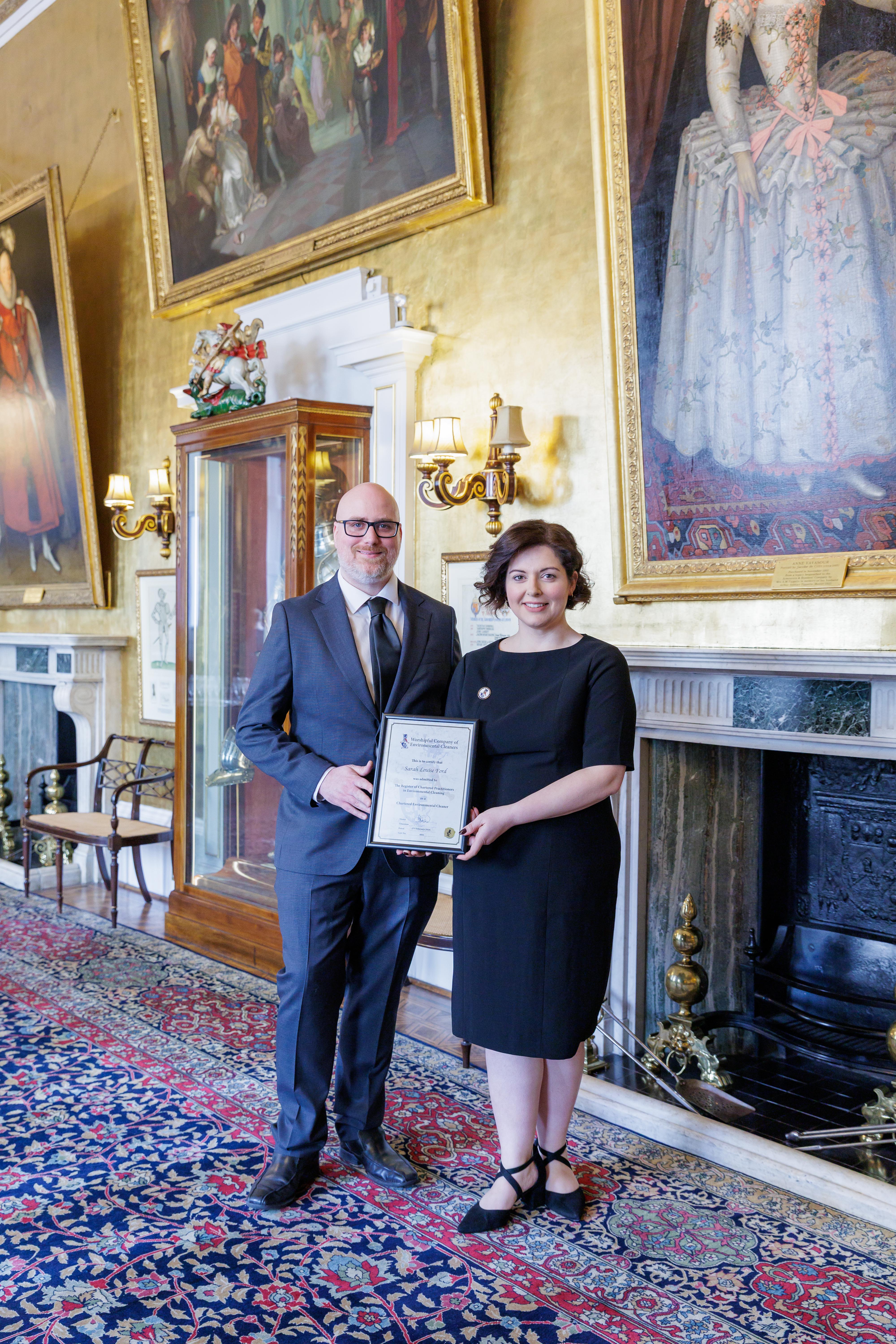 On 17th February, Sarah Ford travelled to London to formally receive her Chartered Practitioner certification in Environmental Cleaning — the highest professional recognition available within the cleaning and facilities management industry.
